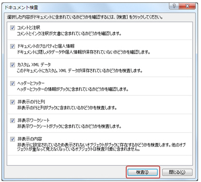 「ドキュメント検査」ダイアログで「検査」をクリック