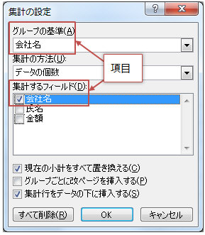 「グループの基準」および「集計するフィールド」を項目(会社名)とし、「集計の方法=データの個数」として「OK」をクリック