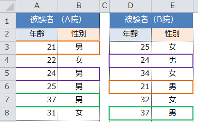 ★ A院とB院で「年齢」と「性別」が一致するデータを検索したい