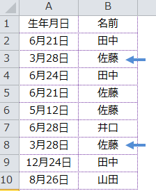 生年月日と名前の組み合わせが同じ行に色を設定します。