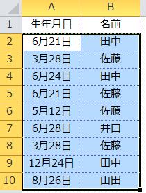 ◆◆ パターン1:同一表内で重複レコードに色を付ける(例↓生年月日と名前が同じ行)◆◆