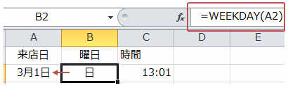 ◎ ↓の例では曜日(B2)はWeekday(日付(A2))により曜日数値(1~7)にして表示形式をaaaとしています。同じ曜日なら同じ数値になるので統計がとれます。