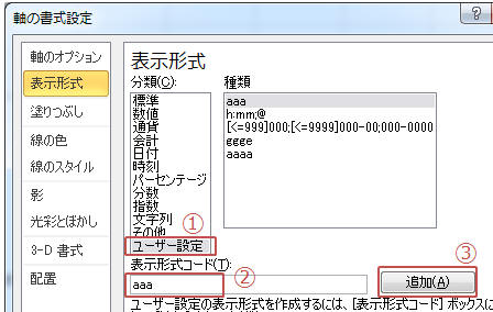 「表示形式」タブで「ユーザー設定」をクリックし「aaa」など