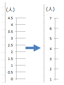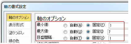 ★ 例:軸の表示を1~7までとし、目盛りの間隔を1に変更してみましょう。