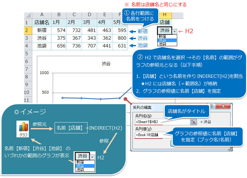 Excel2010:グラフの参照範囲をINDIRECTを切り替える方法 |