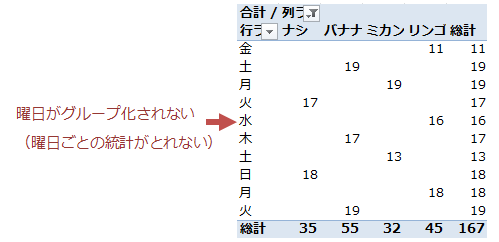 ピボットテーブルで曜日ごとに分析したい(グループ化)場合は、Weekday関数でシリアル値を曜日を表す数値に変換します。(又は文字列として入力)