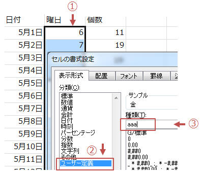 曜日セルの表示形式を「aaa」とする(セル選択→右クリック→セルの書式設定→ユーザー定義→aaa)