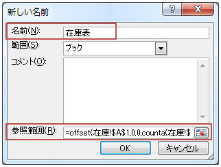 任意の名前を入力し「参照範囲」にOFFSET関数でセル範囲を指定し「OK」をクリック