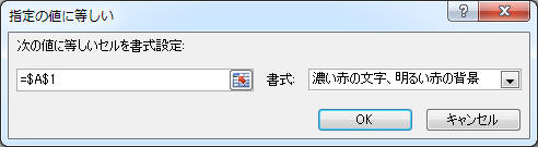 「指定の値を含むセルだけを書式設定」を選択し「セルの値」「次の値に等しい」「=$A$1」とし「書式」で色を指定して「OK」