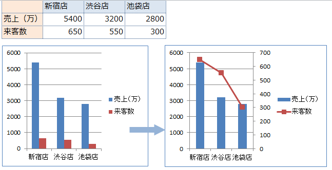 例:各店舗の【売上】と【来客数】をグラフ化しましたが単位が異なるので、来客数を折れ線グラフにし第2数値軸で表示しましょう。