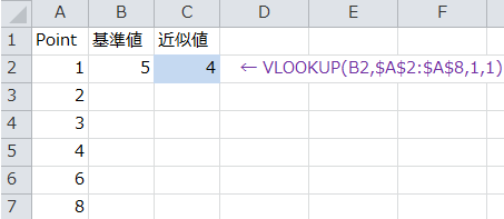 下図でB2(基準値)を超えない近似値を返すにはVlookup関数で検索方法の引数を1(True)にします。