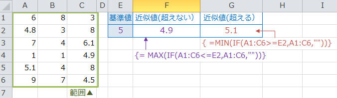 【基準値以上の数の中で最も小さい値】を返します。(例:5が基準値なら5以上の数字(6,7,8)の中で1番小さい6が近似値)MIN関数とIF関数を使います。