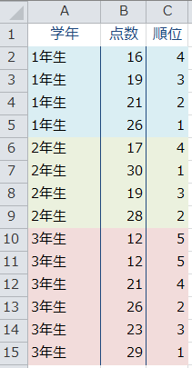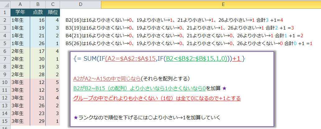 C列に学年ごとの順位を一括で出すには次の配列数式を入力します。 {=SUM(IF(A2=$A$2:$A$15,IF(B2<$B$2:$B$15,1,0)))+1} A2がA2~A15と同じなら(同じ学年のみの配列を抜き出し)、B2が配列の各値より小さいなら1(0,1,1,1)としてこれを加算(小さければ順位が下がる)し、最後に1を足す(1位は全て0なので(各値より小さくない)合計0になってしまうため、+1で順位を出す) 解説 補足 今回は点数なので降順で出します(数が多い方が上位)よって範囲より小さいなら1、そうでないなら0を合計します(→小さい方が合計数が多い=順位が低い) 昇順で出す(判定が小さい方が上位)場合は範囲より大きいなら1、そうでないなら0で合計します(→大きい方が