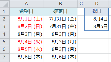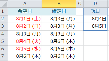 WORKDAY(希望日-1,1,祝日)