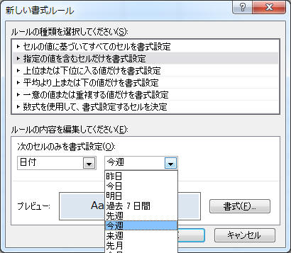 Excelでは先週・今週・来週・先月・今月・来月・昨日・今日・明日…などに簡単に色を設定できます。(条件付き書式)