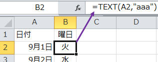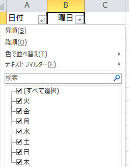 A列の日付が表示形式aaa(曜日)の文字列で表示され、オートフィルタで曜日が表示されるようになります。 |