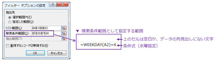 ■ 方法2:フィルタオプションを使って=WEEKDAY(日付セル)=1の数式で条件を作る