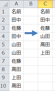 ◆ パターン1:A列の重複データを除外し、一意の値だけをC列に取り出す(集計なし)