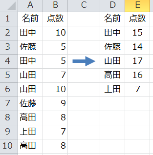 A列(名前)範囲のみ選択し、パターン1と同様の操作で一意のデータを取り出す(D列) 隣の列(E2)に 次の式を入力しオートフィル = SUMPRODUCT(($A$2:$A$10 =D2)*1,($B$2:$B$10)) ★式は {=SUM(IF($A$2:$A$13=D2,$B$2:$B$13))}でもOK!