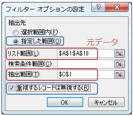 「抽出先」を「指定した範囲」とし「抽出範囲」にC1を指定