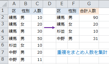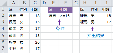 フィルタオプションでデータを取り出し(区と性別を条件)SUMPRODUCT((E2=$A$2:$A$8)*(F2=$B$2:$B$8),$C$2:$C$8)