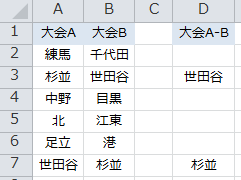 ◎A列とB列で重複するデータをD列 →