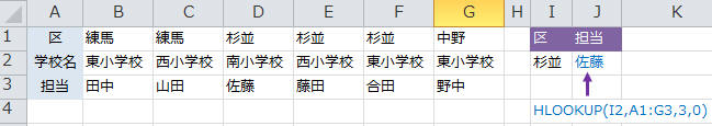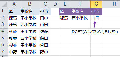 ▼区と学校名を条件に【担当】を取り出す(条件は複数フィールドOK)