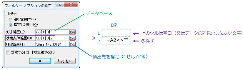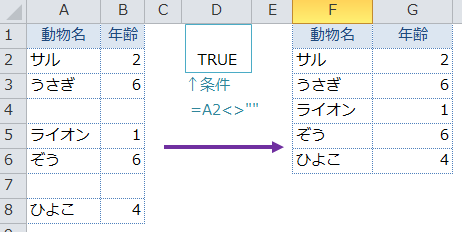 → 抽出先に条件(空白以外のセル)に合致するデータが取り出されます。