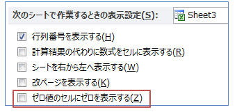 「次のシートで作業するときの表示設定」で「ゼロ値のセルにゼロを表示する」のチェックを外して「OK」