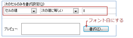 「セルの値」→「次の値に等しい」→「0」とし「書式」をクリックしてフォントの色を「白」にし「OK」