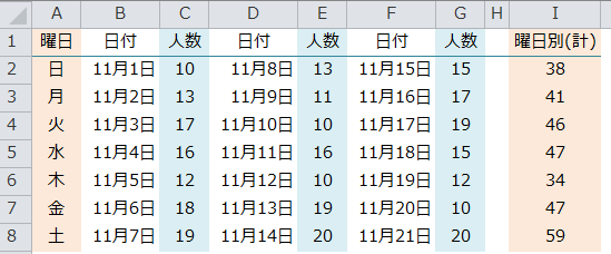 I列にC列・E列・G列に入力されている人数を合計する(1列おきに合計)