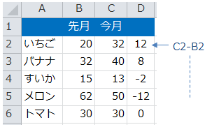 D列に今月-先月の式を入力しオートフィル