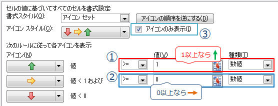 そこで、隣の列に作業用の列を作成し【アイコンのみ表示する】設定にすることで一括してアイコンセットを設定できます!