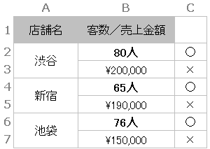 C列に交互に異なるデータ(○×)を入力