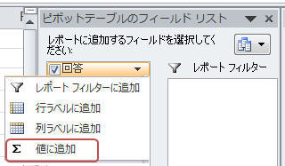 - 再度ピボットテーブルのフィールドリストで【回答】を右クリックし「値に追加」をクリック