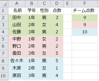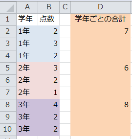 下図のように、○行分が同じ名称(1年、2年、3年)であればSUMPRODUCT関数やSUM(IF…)の配列数式が使えます。