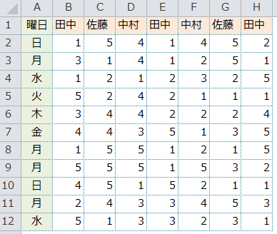 {= SUM(IF((A2:A12="水")*(B1:H1="田中"),B2:H12))}