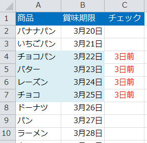 ■ 賞味期限の3日前のデータに色をつける