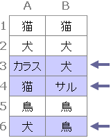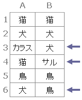A列とB列で値が異なるセルに自動で色を付けたい