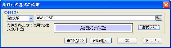 「数式が」を選択し、ボックスに =$A1<>$B1 (A1とB1がイコールでないなら) の式を入力