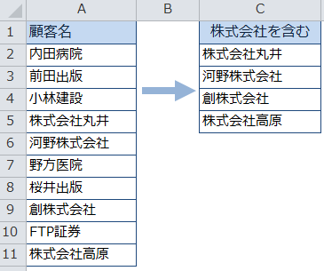 {=IFERROR(INDEX($A$2:$A$11,SMALL(IF(ISERROR(FIND("株式会社",$A$2:$A$11)),"",ROW($A$2:$A$11)-1),ROW()-1)),"")