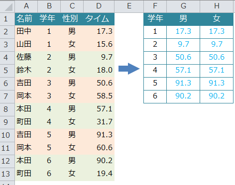 例:学年ごとに男女別のタイムを表示する(表の形を変える)
