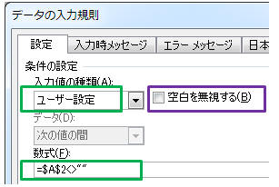 「設定」タブ−「ユーザー設定」→ 数式 → 「=$A$2<>""」を指定し「空白を無視する」のチェックを外す ★ 条件として=NOT(ISBLANK(A1)) 等も使えます。(空白セル判定方法)