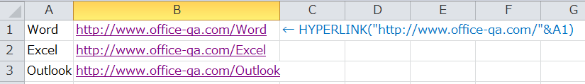 次のように記載します。 =HYPERLINK("http://www.office-qa.com/"&A1) または =HYPERLINK(B1&A1)