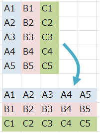 縦横(行列)を入れ替えて配置するならTranspose関数が便利です。元データと値をリンク(連動)できます。