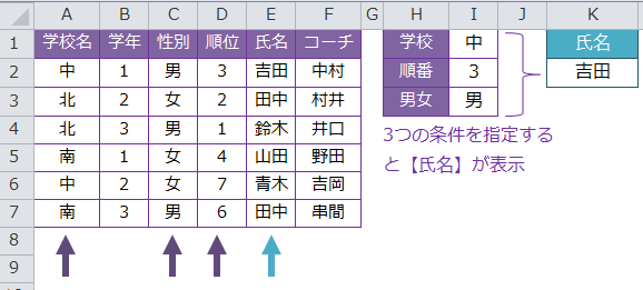 ★複数列から値を取り出す関数としてはDGET関数が早いですが、DGET関数は条件エリアを作成する必要があります(かつ条件エリアは元データと同じ様式で項目行が上) ここではDGET関数が使えない(条件エリアがない、条件エリアはあるが項目名が元データと異なる…等)場合の方法をご紹介します。