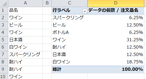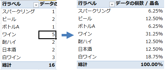 品名の個数がピボットテーブルに表示されるので、任意の個数を右クリックし「計算の種類」−「列集計に対する比率」をクリック