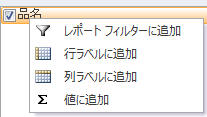 「ピボットテーブルのフィールドリスト」で「品名」フィールドを右クリックして「値に追加」をクリック