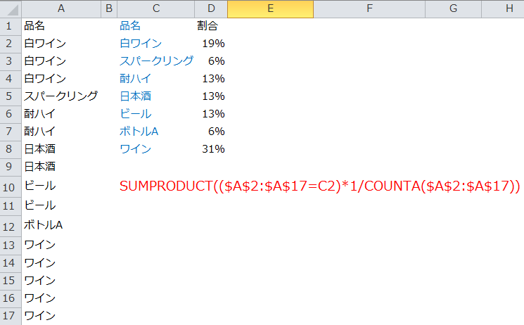 A列(商品)の出現率を出してみましょう。