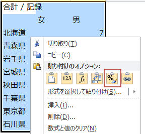 値のみの表が範囲選択されている上で再度右クリックして「書式設定」で貼り付け